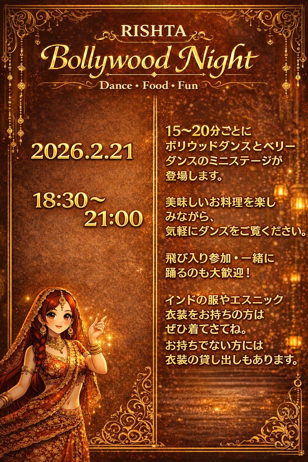 RISHTAでは定番のナンやカレーに加え、ドーサやウタパムをはじめとするさまざまなインド料理をお楽しみいただけます。特にドーサはシェフが長年の研究を経て完成させた独自のレシピで、日本のお米を使用した小麦粉不使用の生地を特徴としており、材料にもこだわっています。ランチタイムには豊富なセットメニューを、ディナーにはインド定番のスパイスのきいたカレーをたくさんご用意しております。辛さの調節もできるので、小さなお子様やご年配の方、辛いものが苦手な方も安心してお召し上がりいただけます。インドのお酒を楽しみたい方にぴったりな飲み放題もご用意しております。