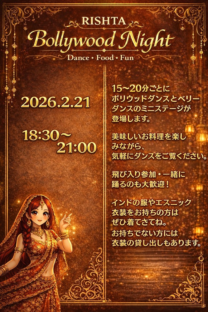 2026.02.03 お知らせ RISHTA Bollywood Night 2月21日(土)18:30-21:00の間ならいつでも、塩尻のリスタでお食事していただくと、Bollywood & Belly Dancerのショーが目の前で見れます。そしてなんと、衣装を着て参加してもOK!お席予約の方はリスタへご連絡ください😃お待ちしております! PDFを開く 一覧へ戻る